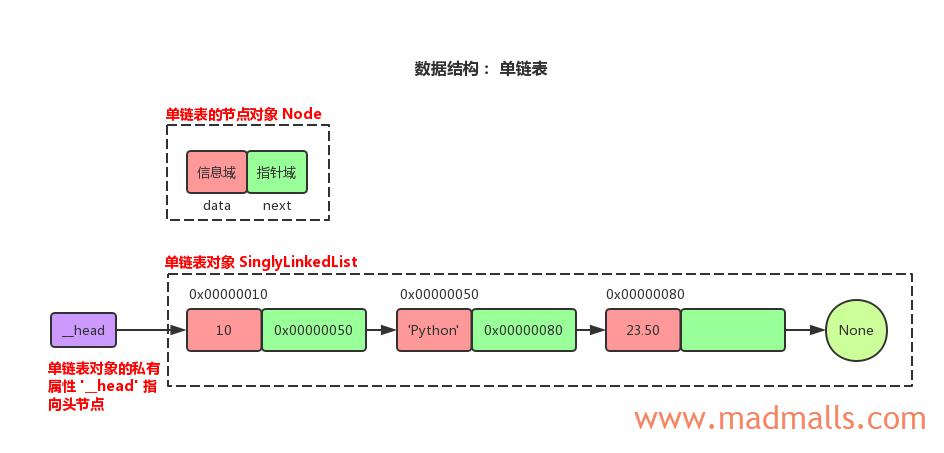 class Node: '''单链表的节点''' def __init__(self, value): self.value = value # 节点的信息域 self.next = None # 节点的指针域 def __repr__(self): return 'Node({!r})'.format(self.value)