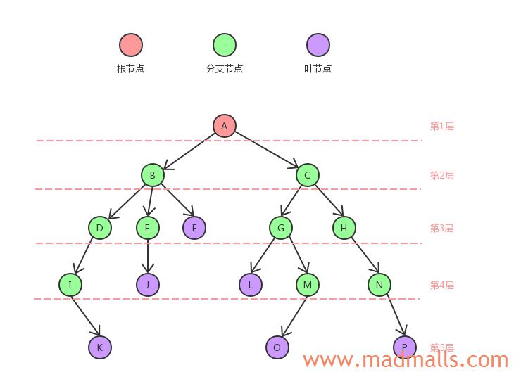 子节点(Child): 一个节点含有的子树的根节点称为该节点的子节点。比如上图中,节点B往下也是一棵树,这个子树的根节点就是B,所以节点B是节点A的子节点(该子树是节点A的左子树);同理,节点C也是节点A的子节点父节点或双亲(Parent): 若一个节点含有子节点,则这个节点被称为其子节点的父节点。比如上图中,节点A就是节点B或节点C的父节点兄弟节点(Siblings): 具有相同父节点的节点互称为兄弟节点。比如上图中,节点B和节点C的父节点都是A,所以他俩是兄弟节点节点的层次(Level): 从根节点开始算起,根为第1层,根的子节点为第2层,以此类推堂兄弟节点:父节点在同一层的节点互为堂兄弟。比如上图中,节点F的父节点是B,节点G的父节点是C,他俩的父节点在同一层,所以节点F和G是堂兄弟节点的祖先(Ancestor): 从根到该节点所经分支上的所有节点。比如上图中,节点K的祖先是A、B、D、I节点的子孙(Descendant): 以该节点为根的子树中任一节点都称为该节点的子孙。比如上图中,节点B的子孙是D、E、F、I、J、K节点的度(Degree): 一个节点含有的子树的个数称为该节点的度。比如上图中,节点A的度是2,节点B的度是3,节点K的度是0叶节点(Leaf node): 度为零的节点。比如上图中,节点K、J、F、L、O、P都是叶节点分支节点(Branch node): 度不为零的节点树的度: 一棵树中,最大的节点的度称为树的度。比如上图中,节点B的度为3,它是所有节点中度最大的,所以树的度是3节点的深度(Depth of node): 对于任意节点,它的深度为从根节点到它的唯一路径长。比如上图中,节点B的深度为1,节点K的深度为4,节点A的深度为0(根节点的深度为0)节点的高度(Height of node): 对于任意节点,它的高度为从它到叶节点的最长路径长。比如上图中,节点B到叶节点K的路径长为3,到叶节点J的路径长为2,到叶节点F的路径长为1,所以节点B的高度为3;叶节点的高度都为0树的高度(Height of tree): 树的高度是其根节点的高度森林(Forest): 由m(m>=0)棵互不相交的树的组成的集合,称为森林